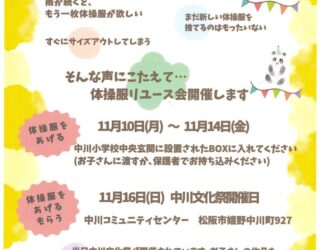 2025年10月27日 体操服リユース会のお知らせ 11月16日の嬉野中川コミュニティーセンターにおいて「嬉野中川文化祭」が開催されます。そのブースのひとつとして、「中川小... カテゴリー 学校活動の様子/2025年度/お知らせ