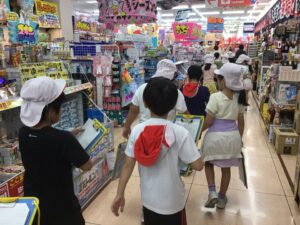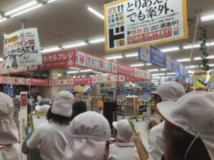 MEGAドン・キホーテ嬉野店に校外学習に出かけました。Aコープの見学の時と同様に、店内の様子やバックヤードを見学させていただきました。従業員の方々にインタビューや質疑応答の時間も取らせていただきました。ありがとうございました。さらに、校外学習での児童の安全確保のために、CSサポータさんにもご協力をいただきました。