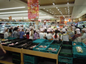 A-コープ嬉野店に校外学習に出かけました。開店と同時に到着し、店内の様子やバックヤードを見学させていただきました。また、品出しや調理、レジをしてみえる従業員の方々にインタビューをさせていただきました。ありがとうございました。さらに、校外学習での児童の安全確保のために、CSサポータさんにもご協力をいただきました。