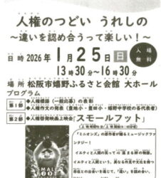 1月25日(日) 13:30~16:30 松阪市嬉野ふるさと会館にて、嬉野人権教育研究会主催の「人権のつどいうれしの」が...